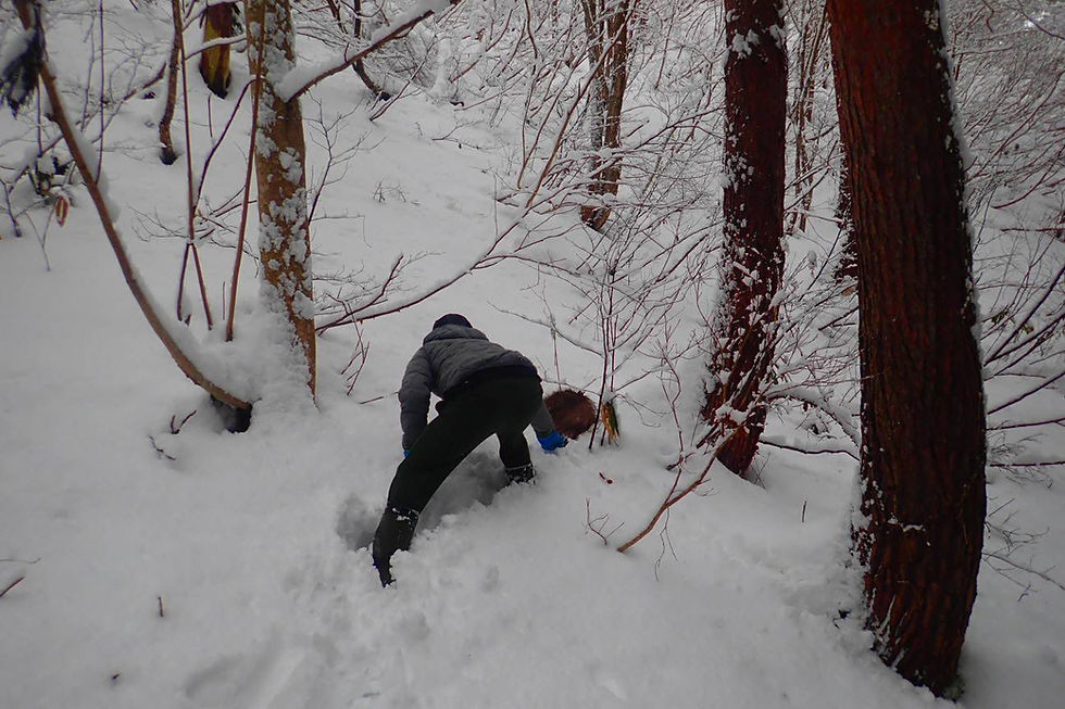 初日から、高野尾さんとその仲間の方々に同行させていただいた。 急な登り下りのある山道を進み、笹藪をかき分ける。 動物を見つけるため、皆で一斉に笹薮を切り、足場を作り、視界を開いていく。